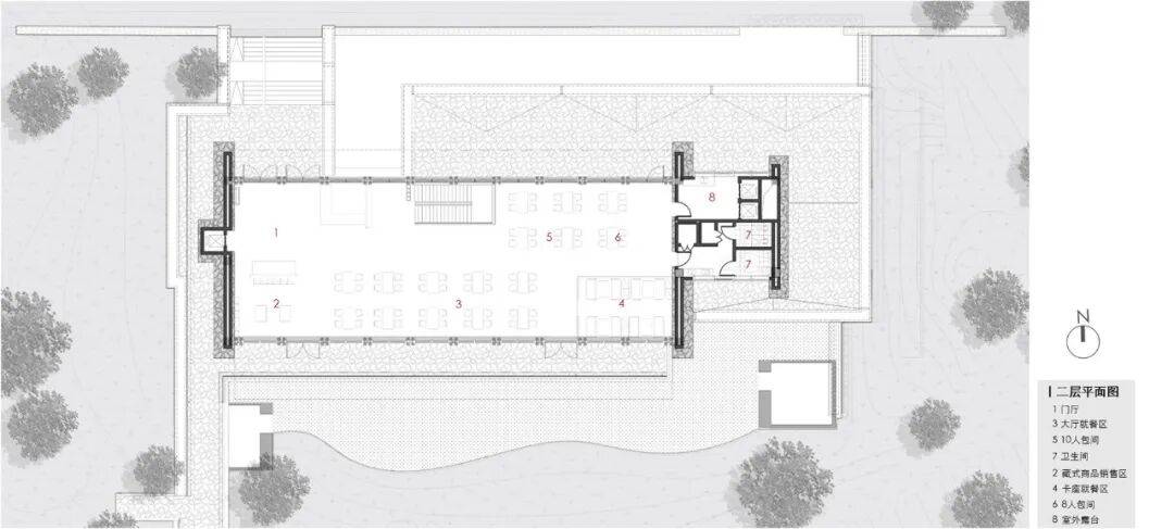 蓝月山谷餐厅二层平面图(图源:西南院) 完整项目信息 项目名称:稻城县亚丁村保护恢复规划 项目地点:甘孜州稻城县亚丁村 设计时间:2022年11月——2023年3月 建成时间:2024年5月 用地面积:约700亩(含生态修复范围) 建筑面积:约1万平米(含新建与改建) 业主单位:稻城县资产投融资集团有限公司 设计单位:中国建筑西南设计研究院有限公司 室内设计单位:四川创视达建筑装饰设计有限公司 设计总负责人:刘艺 设计副总负责人:马俊 奉婷 建筑专业:梁庆华、吴彩菱、刘进才、黄萱萱、张志雄、张婧怡、姜朝旺、张月 结构专业:龙卫国、廖理安、周浩璋、陶磊、陈元龙、张毅、李苡松、许予东 给排水专业:蒋海波、郭礼宝、杨世忠、陈晓超、普孝钦、王铁竹、韩庆昌 暖通专业:熊小军、郭平、赵阳、杜高、赵欣怡 建筑电气专业:刘卫、丁新东、江龙、张龙乾、谭超 建筑智能化及泛光专业:张晓刚、栾小荷、尹霞 景观专业:陈宏宇、陈军、吴沁竺、崔胜菊、程懿昕、潘宇翔、杨洋、李欣薇、黄振华、 王官琪 建筑技术专业:窦枚、葛声乐 规划专业:邹莺、孔垂婧、崔方迪、秦文智、李佳泊 市政专业:赵刘伟、李琰、吕晓亮、卢洲 室内设计专业:张灿、张利、李文婷、周小辉、王良芬、唐俊、刘文静、杨颜、唐佳、魏艾徐茂雅、范晋丽