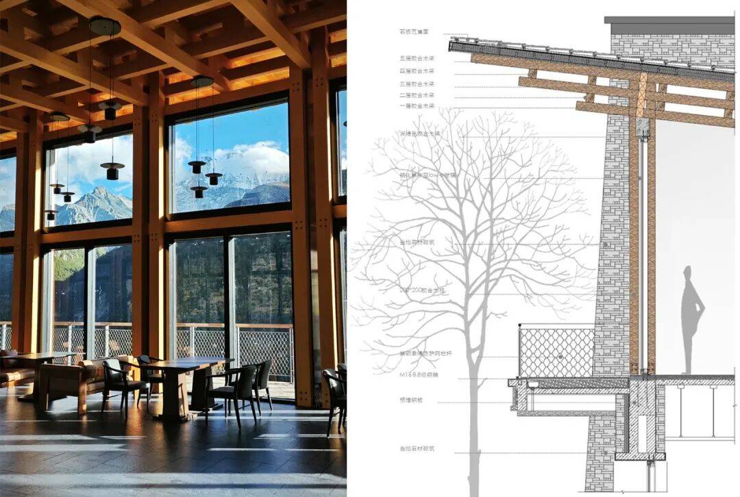 蓝月山谷(摄影:尹庆华) 蓝月山谷餐厅 亚丁村南侧是陡峭的山谷,也是离雪山最近的地方,沿着山谷边缘设计了一条观山栈道,起点是博物馆,终点是一座游客餐厅。餐厅名字取自于小说《消失的地平线》中描述的隐匿在喜马拉雅山脉深处的蓝月山谷。 来到稻城亚丁的人都说“眼睛在天堂,身体在地狱”,餐厅提供的美食,是对游客身体最好的抚慰。建筑用地稍低于景区道路,因而采用了吊层式设计。上下层分别采用了两种结构体系,下部为混凝土结构,安排后勤房间,用以垫高地势,外墙用石块砌筑,封闭厚重。上部采用胶合木结构,色彩温暖,就餐区以落地玻璃墙围合,最大程度地纳入高原阳光和雪山景色,风景即是第一道佳肴。