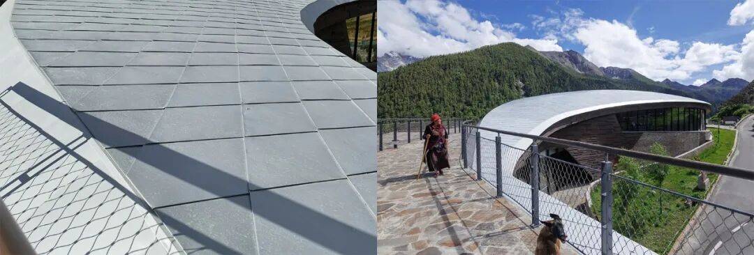 博物馆公共大厅(摄影:存在建筑) 博物馆的形态经过多个方案的比较,最后选择了顺应地形的弧线体量,以更好地融入高山峡谷的自然环境;并与亚丁村民居的矩形体量相区别,突显建筑的文化身份,表达藏文化中香巴拉(即香格里拉)梦想之地的浪漫想象。银白色的屋顶象征着山巅的终年积雪,由鱼鳞状的披叠金属板拼接而成。阳光在板面的反射,让人想起藏地寺庙的鎏金金顶,闪耀的屋顶成为高原的地标。
