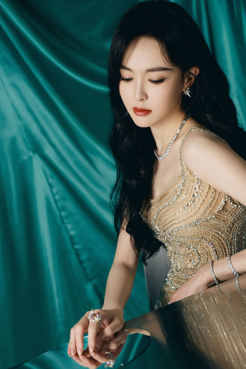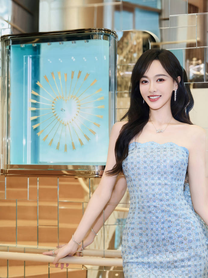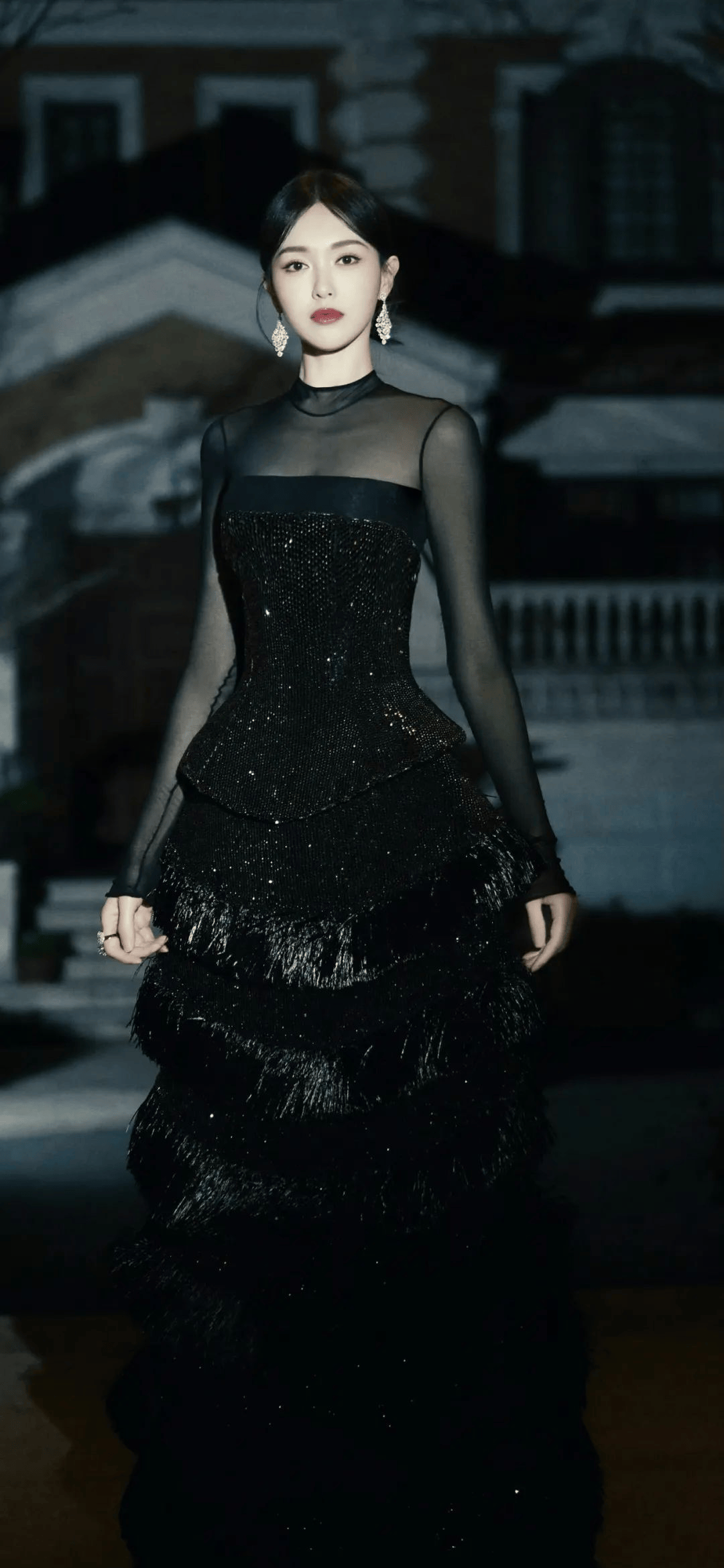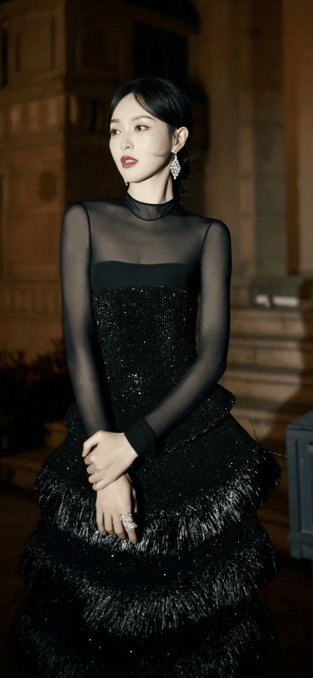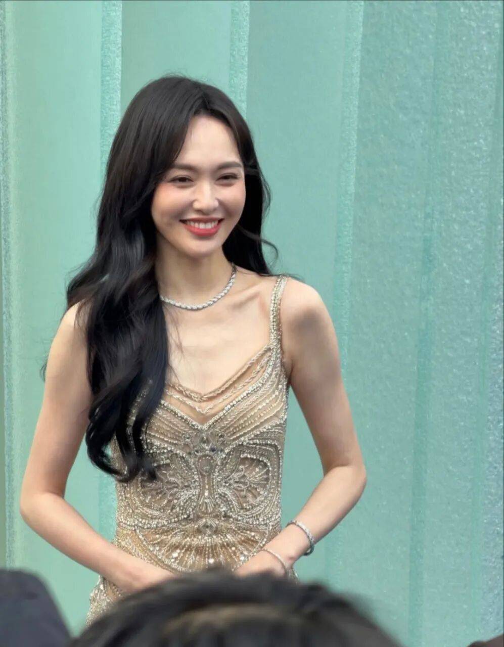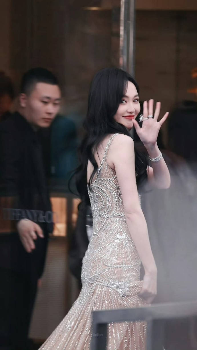 这种低饱和冰蓝色自带高级滤镜,既衬得肤色通透白皙,又能在人群中脱颖而出。唐嫣用松弛的姿态驾驭着这套造型,没有过度修饰,却让每一个细节都恰到好处 —— 从裙身的亮片光泽到珠宝的细碎闪烁,都在诉说着 “低调的奢华”。